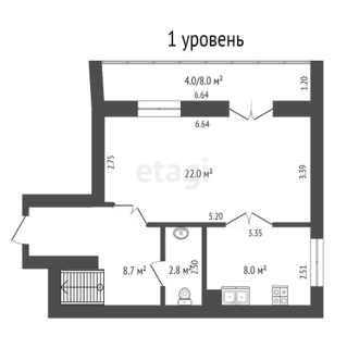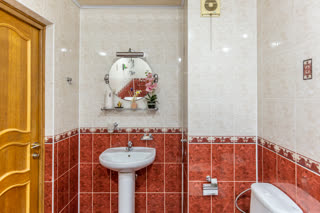 - На первом уровне располагается большая кухня-гостинная с огромной сдвоенной лоджией. Установлен кондиционер. Гостевой санузел с душевой кабиной.