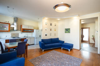 - Планировка: 3 изолированные комнаты, огромная кухня 30 м², большая прихожая, раздельный санузел с ванной-джакузи и душевой кабиной.