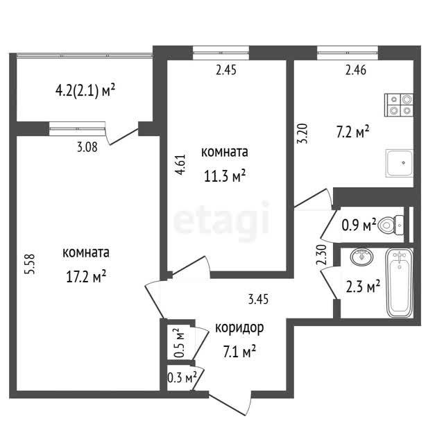 48,9 кв.м. по СНБ общей площади с удобным зонированием: две изолированные комнаты (17,2 кв.м. и 11,3 кв.м.), раздельный санузел, кухня 7,2 кв.м. и застекленная лоджия.